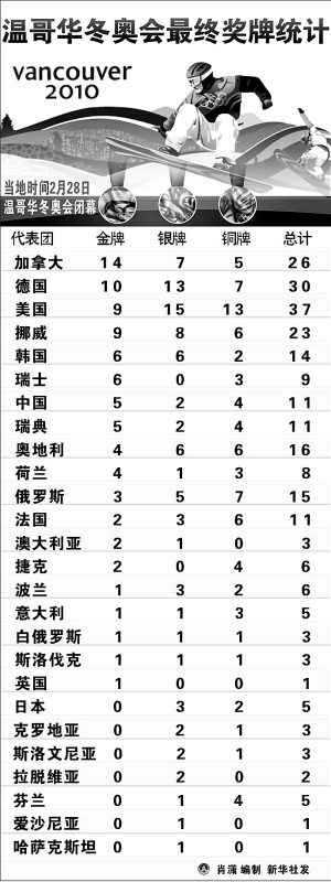 “东道主效应”再次在奥运赛场上得到印证,上届冬奥会排奖牌榜第五位的加拿大代表团这次在家门口以14金7银5铜荣登榜首,而且打破了从未在本土举行的奥运会上夺得金牌的“魔咒”。冬季运动传统强国德国、美国和挪威排在第二至第四位,成为领跑的第一集团。