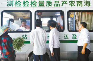 | 3月1日,几位农民和客商,在澄迈县永发镇果菜批发市场的农业流动服务站前,等待外销的豇豆检测结果。近日,该县农业执法部门分别深入县属瓜菜生产基地和收购点,通过检查严防非法使用高毒、高残留农药瓜菜流入市场。