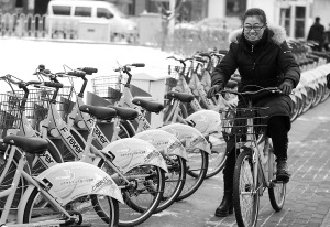 3月1日,在北京地铁5号线东四站外的自行车租赁点,社区居民刷卡后骑走一辆自行车。 当日,位于北京朝阳门地区的首批4个公共自行车免费租赁站点正式启用。附近社区居民可凭自己的身份证到所在居委会和社区服务中心办理一张“诚信卡”,凭卡享受免费自行车租赁服务。四个租赁站通借通还。 新华社发