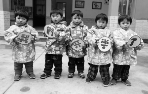 3月1日,正式入托的“五胞胎”一起合影。 当日,安徽首例“五胞胎”正式入学安庆一家幼儿园,开始接受3年的免费学前教育。 安徽省太湖县产妇史有琴于2006年在安庆市立医院剖腹产下三女两男五胞胎。几年来,社会各界向这个并不宽裕的家庭伸出援助之手,捐款捐物,使“五胞胎”健康快乐地成长。 新华社发
