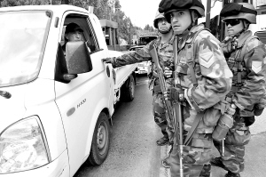 ↑ 士兵在地震重灾区康塞普西翁市收费站检查。