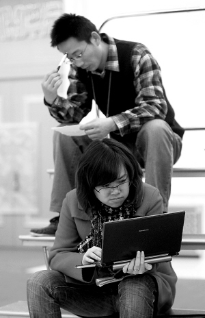 →3月2日,全国政协十一届三次会议新闻发布会,一位记者在苦苦思考新闻点。