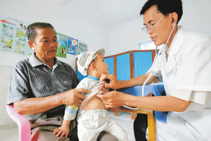 | 在三亚凤凰镇槟榔村医疗卫生室,医生正在给小村民检查治疗。 本报记者 张杰 摄 |