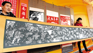 3月3日,河南省陕县西张村镇南沟村剪纸艺人任育新经过4个月创作完成的《百虎图》在郑州非物质文化遗产展示中亮相。这幅6米长的剪纸作品由一张黑纸剪成,共有100只形态各异的老虎。陕县西张村镇南沟村有着百年剪纸历史,是以传统的黑色剪纸而成名,南沟村剪纸已成为河南省非物质文化遗产。 新华社发