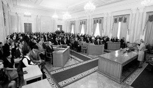 | 3月3日,乌克兰看守内阁总理季莫申科(右)在基辅与政府办公厅工作人员举行告别会。在议会通过对政府的不信任案后,季莫申科召集政府办公厅的高级工作人员在政府大厦内的大会议厅开会,并与他们告别,随后前去休假。季莫申科说,看守内阁的第一副总理图尔奇诺夫将履行代总理职务。 新华社发(普罗科片科摄) |