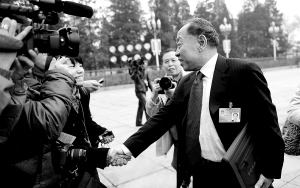 | 3月4日上午,十一届全国人大三次会议举行新闻发布会。大会发言人李肇星步入人民大会堂时,被许多记者围住采访,李肇星微笑和大家握手致意,并祝大家新年快乐。