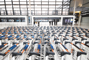 3月4日拍摄的虹桥机场新航站楼内的旅客行李推车。 2010年上海世博会重要配套工程———虹桥机场新航站楼将于3月16日正式启用迎客。目前,虹桥机场扩建工程已通过中国民航局组织的行业验收。 新华社发