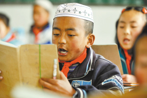 3月4日,积石山县侨爱希望小学四年级保安族学生马成祥在教室里读书。 积石山保安族东乡族撒拉族自治县是我国保安族的主要聚居地,也是甘肃省唯一的一个多民族自治县。从今年3月份开始,积石山县政府拿出2300万元财政资金,配合中央“两免一补”政策,在全县实施从幼儿园到高中教育的包吃、包住、包学习费用的“三包”政策,全县4.4万名学生开始享受“全免费”教育。 新华社记者 聂建江 摄