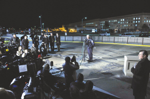 | 3月4日,在美国五角大楼外,驻守国防部的警方发言人理查德·基比尔向媒体说明枪击事件情况。 新华社发 |