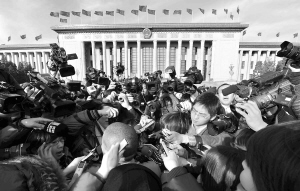 | 3月5日,媒体记者在人民大会堂前争相采访一位全国人大代表。当日,第十一届全国人民代表大会第三次会议在北京人民大会堂开幕。 新华社记者 杨宗友 摄 |