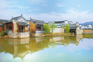 村口的大水塘边,孤单的立着两株垂柳,一株柳条下泊着无桨的废弃木舟,一处树荫中藏着停转的巨大水车。柳条能隐去水声桨声车影却不能盖住古徽州气韵,柳条后层层叠叠的马头墙让人不禁呤起那幽怨的词句:庭院深深深几许,杨柳堆烟,帘幕无重数……