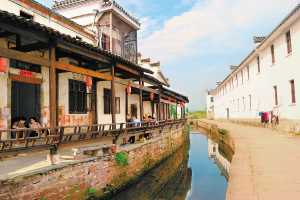 小西湖连着一条小溪。溪流中成群的鸭子顺水且歌且游,两岸石板路上黄狗追着公鸡满世界乱跑。当溪流逐渐摆脱两岸的水田,两排的青瓦白墙老屋就把溪流揽入怀抱。这儿便是有名的“水街”。虽以街名,但是却没有市井的喧嚣,四周是让人想象不到的宁静,甚至溪流都平缓得看不到涟漪。