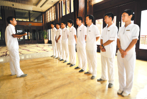 3月7日,三亚丽思卡尔顿酒店会务礼宾部的员工们正在进行贵宾信息认知培训。对于即将入住该酒店的博鳌国际旅游论坛的嘉宾,他们不仅能在初次见面时亲切地叫出客人的名字,同时还能知道客人是什么民族,什么信仰,甚至客人喜欢的饮料、就寝的时间都一清二楚。 本报记者 王凯 摄