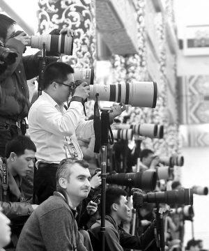 | ↑3月7日,人民大会堂三楼金色大厅举行中外记者会上“长枪短炮”的记者。 |