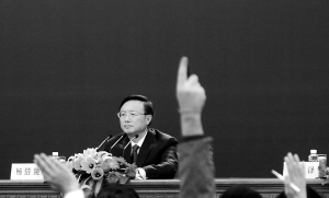 | ↑3月7日,十一届全国人大三次会议在人民大会堂三楼金色大厅举行中外记者会,记者举手向外交部部长杨洁篪提问。 |