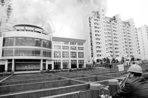 3月7日,在衡阳市高新技术产业开发区内,工作人员在待平移的建筑物前操作同步液压系统。这次平移的建筑物楼长52.5米,宽21.5米,中间4层,两侧3层。据介绍,本次平移工程需将该建筑整体向北平移29米,再转向西平移99米,抬高2.2米,整个平移过程预计需要20多天。 新华社发