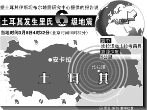 土耳其伊斯坦布尔地震研究中心说,地震发生于当地时间凌晨4时32分,震源深度为5公里,震中位于东部埃拉泽省卡拉考昌县,距离首都安卡拉大约550公里。