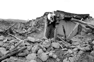 | ← 在土耳其埃拉泽省,一名妇女站在被震毁的房子旁。