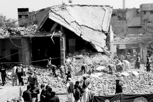 70多人伤亡,塔利班宣称负责 3月8日,在巴基斯坦东部城市拉合尔,救援人员在自杀式汽车炸弹袭击现场搜寻。 当天,位于巴基斯坦东部城市拉合尔的巴联邦调查局大楼遭到自杀式汽车炸弹袭击,造成至少11人死亡、60人受伤。塔利班武装组织宣称对炸弹袭击事件负责。 新华社/法新