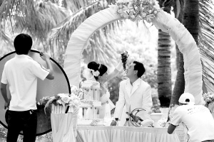 3月8日,春天的三亚,迎来了全国各地的新婚佳丽游玩观光,共度美好时光。在三亚湾畔,一天便有几十对岛内外新人在此拍摄婚纱照,三亚湾仿佛成了伊甸园。图为一对新人在三亚湾拍摄甜蜜婚纱照情形。 特约记者 孙清 摄