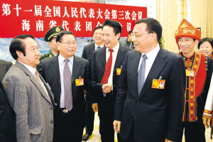 | 3月8日,中共中央政治局常委、国务院副总理李克强参加十一届全国人大三次会议海南代表团的审议,与海南团代表亲切交谈。