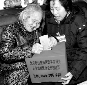 ← 2003年12月10日,北京市八宝山街道瑞达社区102岁的韩桂英(左)老人在家中投票选举石景山区人大代表,这是她第16次参加投票选举。