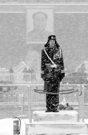 3月8日,北京天安门广场,为全国“两会”值勤的国旗护卫队雪中站哨。 当日,北京普降中到大雪,北京市气象台发布了道路结冰黄色预警信号。这是北京近5年来全国两会召开期间首次遭遇雪天。 本报特派记者 李英挺 摄