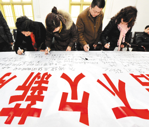 3月8日,武汉市一些建筑企业的代表在倡议条幅上签字承诺“讲诚信,不欠薪”。 当日,武汉建筑业协会发起“向‘信义兄弟’学习,树立行业诚信形象”的倡议,倡导“讲诚信、不欠薪”,该市数十家主要建筑企业纷纷响应。 新华社发
