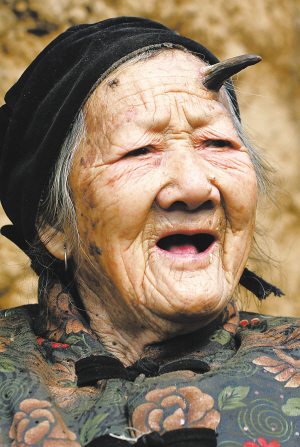 百岁老妪头上长角