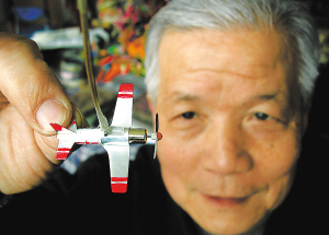 在西安市群众艺术馆,古稀老人张天伟在展示自己的“新玩具”———一架长约4厘米、翼展约4.6厘米的小飞机(3月8日摄)。 张天伟老人是陕西省工艺美术一级大师,曾经制作过130多米长的巨型风筝和2厘米长的微型自行车。最近,他的孙子玩坏了一个玩具潜水艇,他发现里面有一枚小电机,就利用三天时间,把铝片制作的螺旋桨和机翼安装在小电机上,一架能飞的微型飞机就此诞生了。 新华社记者 丁海涛 摄