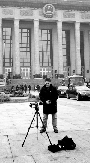 ↑ 3月6日,美国彭博新闻社记者安允文架着摄像机在人民大会堂前出镜,一个人既摄像又当文字记者。