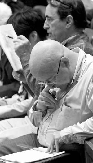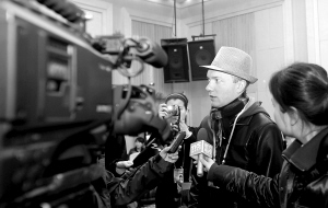 ↑ 3月6日,全国两会新闻中心,俄新社记者谢平也成了国内媒体关注的“焦点”。 本栏照片由本报特派记者李英挺摄