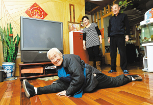 3月9日,93岁的郭连枝老人在家里展示轻松劈腿。 家住山西长治市蔡家巷社区的93岁老人郭连枝,耳不聋、眼不花,手脚利落,令人称奇的是她还能轻松劈腿。郭连枝老人性格开朗,生活规律,平时喜好运动,常年坚持晨练。她年轻时务农,生有六个子女,现在同二儿子一起生活。老人儿孙满堂,其乐融融。 新华社发(姚林 摄)
