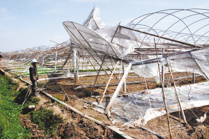 3月10日拍摄的遭龙卷风袭击的葡萄园。 当日4时许,浙江省台州温岭市东部箬横镇家利果业60多亩大棚葡萄遭龙卷风袭击,正在发芽的大棚葡萄苗损失严重。 新华社发(金宗炳 摄)
