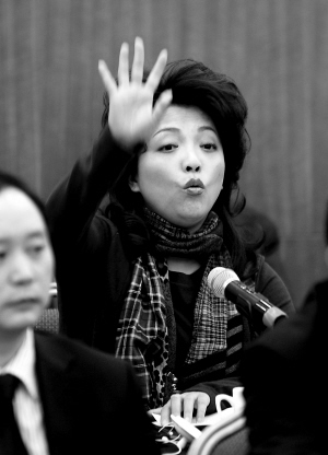 ↓ 3月10日,全国人大代表、重庆市川剧院院长沈铁梅在第一次举手请求发言没有“抢到”发言机会后,再次举手要求发言。 新华社记者 费茂华 摄