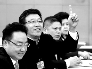↑ 3月6日,全国人大代表、中国钢铁工业协会会长、武汉钢铁(集团)公司总经理邓崎琳就推动我国钢铁工业发展方式、应对国外铁矿石大幅度涨价提出建议。发言后,邓崎琳意犹未尽,就此问题再次发言。 新华社记者 刘建生 摄