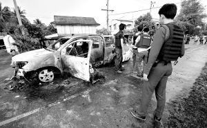 | 3月11日,在泰国南部北大年府,共有3人在当地一起袭击中遇难,遗体随车辆一起被烧毁。 新华社/法新 |