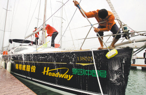 11日上午,原创中国号帆船抵达海口湾码头后,船员在清洗船身。