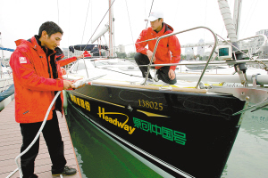 3月11日上午,在海口湾美源国际游艇会码头,参加海南农垦杯’2010年环海南岛国际大帆船赛的帆船陆续到达,这是中远南方号帆船抵达港口后船员在进行休整的情景。目前已有8艘参赛帆船停靠海口湾。 本报记者 张杰 摄