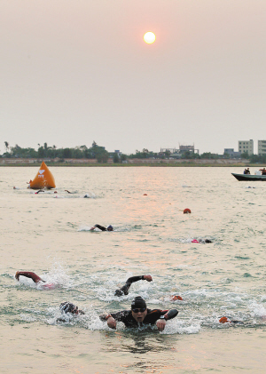 | 3月14日晨7时,中国铁人赛参赛选手在海口南渡江下水进行游泳比赛。