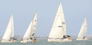 三月十四日,二○一○年环海南岛国际大帆船赛第一赛段从海口出发,首战海口至文昌段,赛程八十一点八海里。 本报记者 宋国强 摄 (相关报道见B7版)