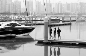 | 3月14日上午,停泊在海口湾美源游艇码头的游艇。