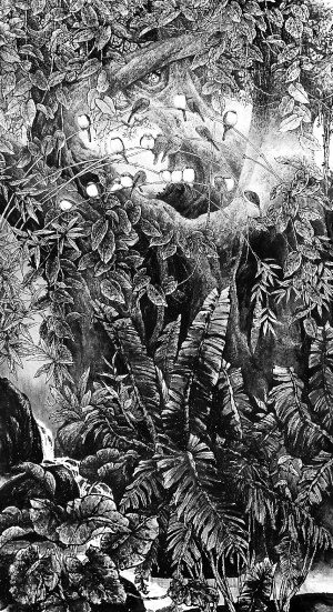 方宝价向记者展示了他那幅40米巨制的《热带雨林》长卷。他说,现代社会发展迅猛异常,生态环境破坏日趋严重,森林被毁伐,水土流失,威胁着人类的生存,曾经养育中华民族,产生中华民族文明的无比博大的土地上,没有被践踏过的绿色净土———原始森林,已经少得可怜。因此,从某种意义上来说,方宝价40米巨制“热带雨林”,是一张绿色的宣言书,呼吁人们重视生态,保护森林,繁衍人类。