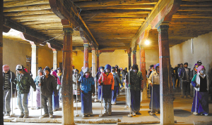 3月14日,文物维修人员在拉萨哲蚌寺措钦大殿的释迦牟尼佛堂打“阿嘎”土。自20世纪80年代以来,中央政府先后拨款7亿元人民币和大量黄金、白银用于西藏寺庙的维修和保护。 新华社记者 格桑达瓦 摄