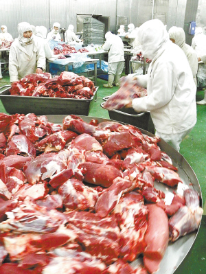 3月13日,内蒙古科尔沁牛业集团的检疫人员在低温流水线车间进行逐块牛肉检疫。该企业引进国际最先进的食品安全生产和检测体系,牛肉产品上市前要经过30多道消毒杀菌工序和10次以上的检疫。产品销售到国内各省市并出口到欧洲10多个国家,未出现一起食品安全事故。 新华社记者 李欣 摄