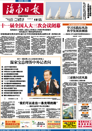 | 海南日报 头版 001 2010-03-151 2010年03月15日 星期一 |