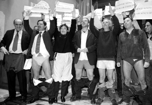 意大利首都罗马大约50名来自左翼政党的市政官员15日聚集到市政厅,以脱裤子方式呼吁尽快通过本市2010财政年度预算。 新华社/法新