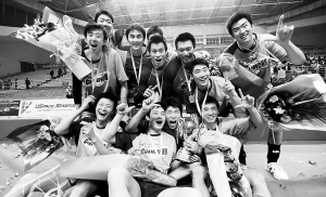 3月16日,在株洲市进行全国男排联赛总决赛中,上海队客场以3比2战胜八一队,以两战两胜的战绩获得冠军。图为上海队夺冠后捧杯欢庆。 新华社发