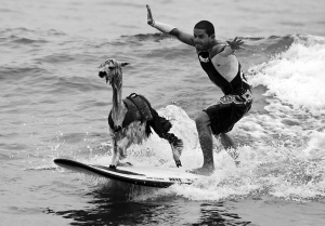 ← 冲浪者多明戈·皮亚内兹在秘鲁首都利马训练他的羊驼皮斯科冲浪。 皮亚内兹曾花费10年时间训练小狗冲浪,现在他成为第一个训练羊驼冲浪的人。 新华社/路透