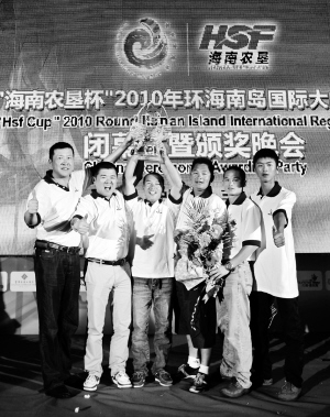| ←3月17日, 2010年环海南岛国际大帆船赛圆满结束。图为夺得冠军的中远南方队队员在颁奖仪式上。